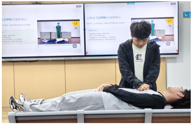 值得一提的是,本次班会还特别融入了生命急救知识普及环节。PPT中详细展示了心肺复苏(CPR)的标准流程,以“叫叫CAB”口诀为核心,讲解胸外按压的位点、深度、频率及人工呼吸与AED使用方法,并播放了标准操作示范视频。通过观看视频、模拟演练,我院同学不仅掌握了基本的急救技能,更增强了对生命安全的敬畏意识与责任感,真正将“珍爱生命”从理念转化为行动。