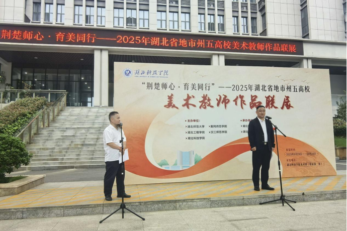 9月29日上午10时,“荆楚师心·育美同行——湖北省地市州五高校教师美术作品联展”在湖北科技学院美术馆隆重开幕。本次展览由湖北省美术家协会、湖北师范大学、黄冈师范学院、湖北工程学院、汉江师范学院、湖北科技学院联合主办,五所高校艺术学院的领导、教师代表及学生代表300余人参加了开幕式。