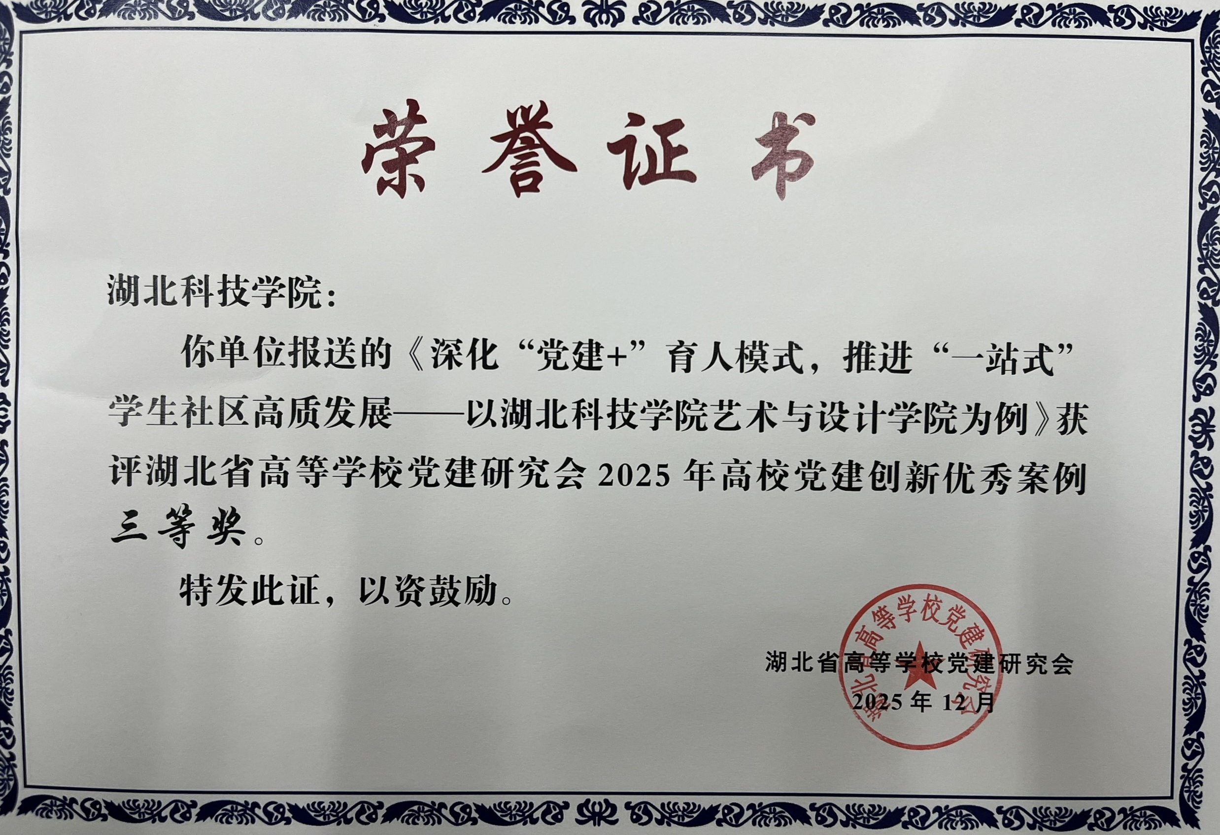 日前,湖北省高校党建“先锋领航汇”暨湖北省高等学校党建研究会2025年年会在武汉召开。艺术与设计学院报送的典型案例《深化“党建+”育人模式,推进“一站式”学生社区高质发展——以湖北科技学院艺术与设计学院为例》获湖北省高等学校党建研究会2025年高校党建优秀创新案例三等奖。